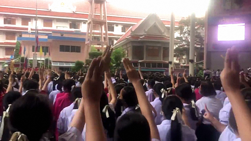 Meanwhile, students of Si Kranuan Witthayakhom School in Khon Kaen province posted photos of police officers allegedly coming to watch over the situation and students in Benjamarachutit School in Ratchaburi province spotted a group of suspicious-looking people monitoring their activity.