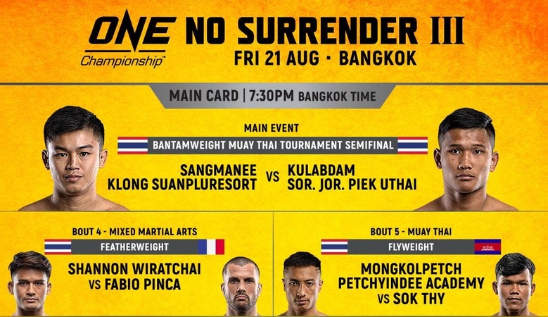 ONE: NO SURRENDER III is the third iteration of the high-profile event series in Bangkok. The headline bout features a ONE Bantamweight Muay Thai Tournament Semifinal showdown between Muay Thai athletes Sangmanee Klong SuanPluResort and Kulabdam Sor. Jor. Piek Uthai.