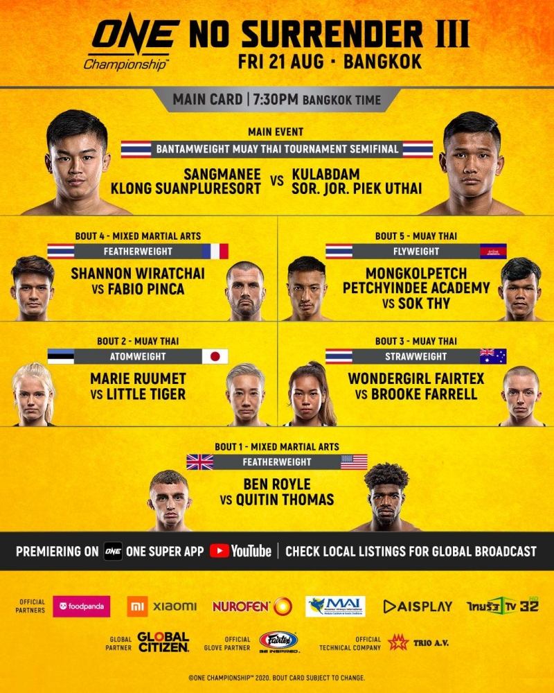 ONE: NO SURRENDER III is the third iteration of the high-profile event series in Bangkok. The headline bout features a ONE Bantamweight Muay Thai Tournament Semifinal showdown between Muay Thai athletes Sangmanee Klong SuanPluResort and Kulabdam Sor. Jor. Piek Uthai.