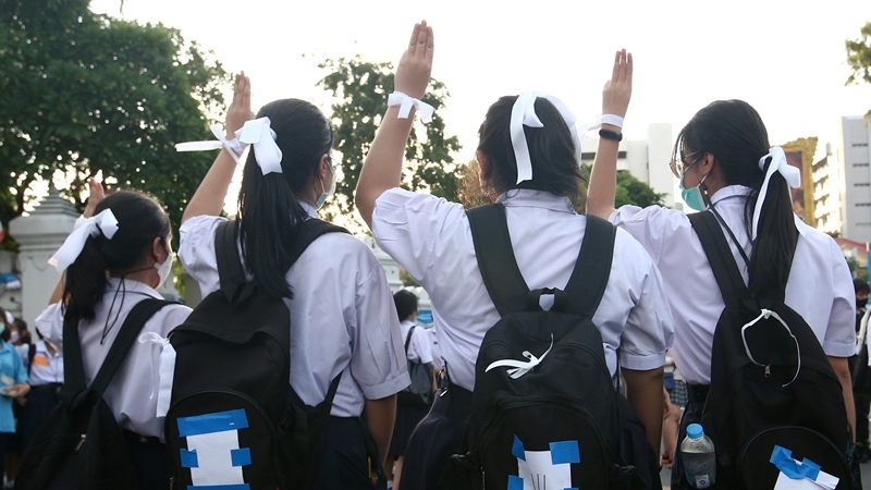 The “Nakrian Laew” or Bad Students group demanded that authorities stop intimidating them for voicing political opinions and called for an end to strict rules on haircuts and uniforms.