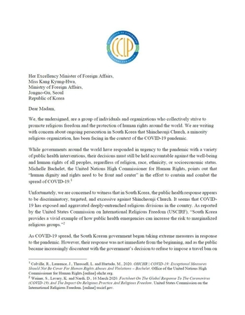 The letter came after 11 NGOs including the European Coordination of Associations and Individuals for Freedom of Conscience submitted an annual report to the UNHCR titled “Scapegoating Members of Shincheonji for COVID-19 in the Republic of Korea”.