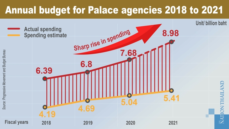 Palace agencies have asked for Bt8.98 billion for 2021 fiscal year (October 2020 to September 2021. The amount was up 16.8 per cent from Bt7.68 billion spent in the current fiscal year, compared to a 3.1 per cent rise in the overall national budget, Thanathorn pointed out.