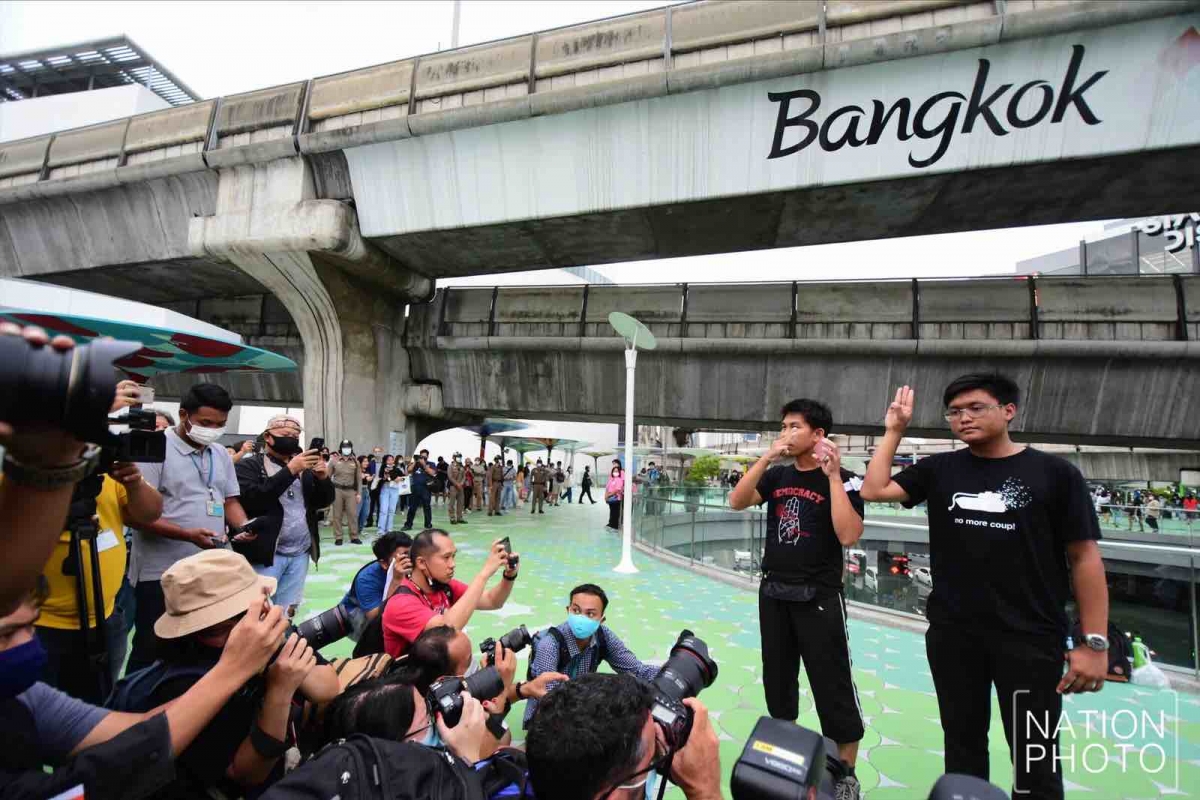 A student of Srinakharinwirot University Sirapop Poompungputh, who represents the group “SWU NewGen”, together with groups of people, held symbolic anti-government activities by singing the national anthem and raising the three-finger salute on Saturday evening on the skywalk at the Pathumwan intersection.