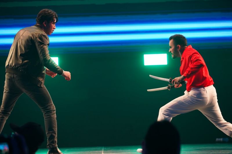 จากนั้นก็เป็นคิวของการต่อสู้ระหว่างโย่งกับวิทย์ด้วยดาบซามูไรสั้น ที่ดุเดือด เลือดพาด แบบไม่มีใครยอมใคร เล่นจริงไม่ใช้ตัวแสดงแทน หลังจากถ่ายทำคิวบู๊เสร็จหนุ่มโย่งได้ให้สัมภาษณ์ถึงความรู้สึกว่า..