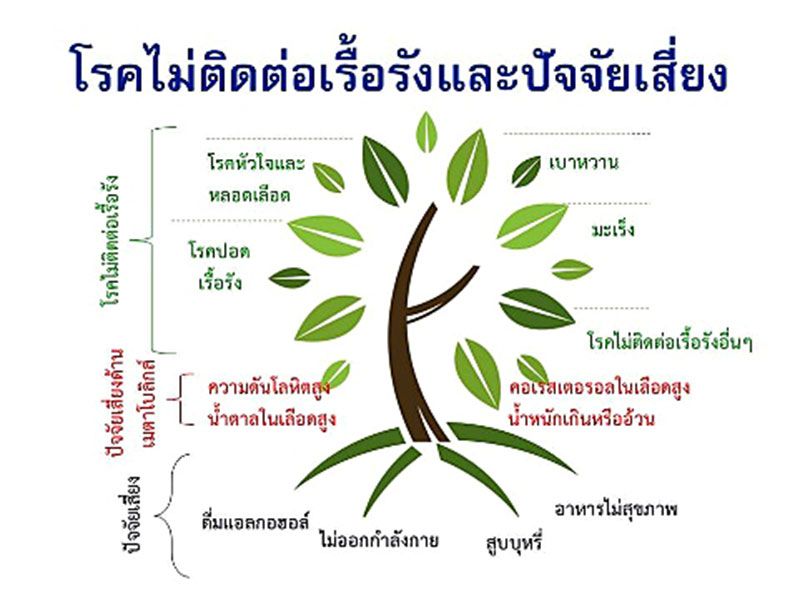หากเปรียบเอ็นซีดีเหมือนกับต้นไม้ รากของเอ็นซีดีก็คือ “ปัจจัยเสี่ยง”ต้นก็คือ “ปัจจัยเสี่ยงทางเมตาโบลิกซ์”และดอกใบของเอ็นซีดีก็คือ “กลุ่มโรคไม่ติดต่อเรื้อรัง” ถ้าเราไม่ให้มีรากเกิดขึ้น ต้นไม้ก็ไม่อาจเติบโต ผลิดอกออกผล แผ่กิ่งก้านสาขาได้ ดังนั้นถ้าเราลดปัจจัยเสี่ยง (ราก) ที่สามารถปรับเปลี่ยนได้ คือการไม่ออกกำลังกาย การสูบบุหรี่ การดื่มแอลกอฮอล์ และการรับประทานอาหารที่มีผลเสียต่อสุขภาพ ก็เหมือนเราถอนรากถอนโคนเอ็นซีดีทำให้ไม่เกิดเป็นลำต้น คือ “ปัจจัยเสี่ยงทางเมตาโบลิกซ์”ได้แก่ ความดันโลหิตสูงคอเลสเตอรอลสูง น้ำตาลในเลือดสูง และน้ำหนักเกินหรืออ้วน เมื่อไม่มีลำต้น ก็จะป้องกันไม่ให้เกิดใบเกิดดอกของเอ็นซีดี ได้แก่ โรคหัวใจและหลอดเลือด โรคเบาหวานโรคมะเร็ง และโรคปอดเรื้อรังตามมาได้