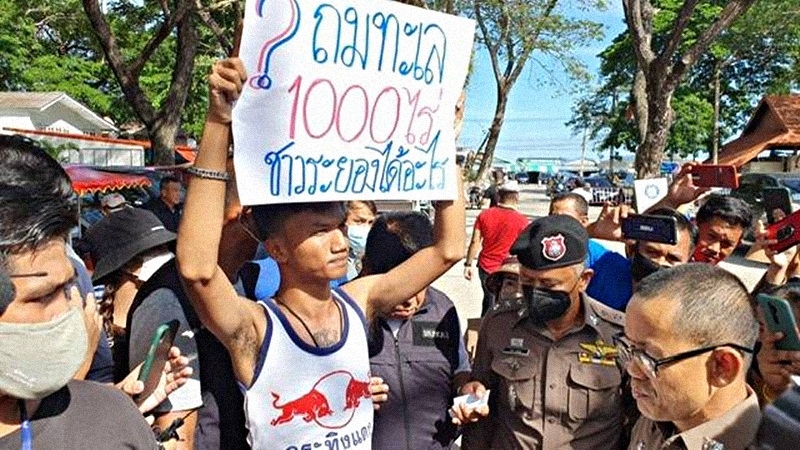 Prominent student activist Panupong “Mike Rayong” Chadnok was arrested on Monday (August 24) for demanding an explanation for the filling up of 1,000 rai of the sea to extend Map Tha Phut port during Prime Minister Prayut Chan-o-cha’s visit to Rayong.