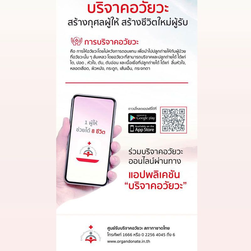 ผู้ที่ประสงค์จะบริจาคอวัยวะ สามารถแสดงความจำนงบริจาคอวัยวะออนไลน์ ผ่านช่องทางแอปพลิเคชัน “บริจาคอวัยวะ” (Application “บริจาคอวัยวะ”) หรือทาง http://www.organdonate.in.th สอบถามข้อมูลเพิ่มเติม ที่เบอร์โทรศัพท์ 02-256-4045