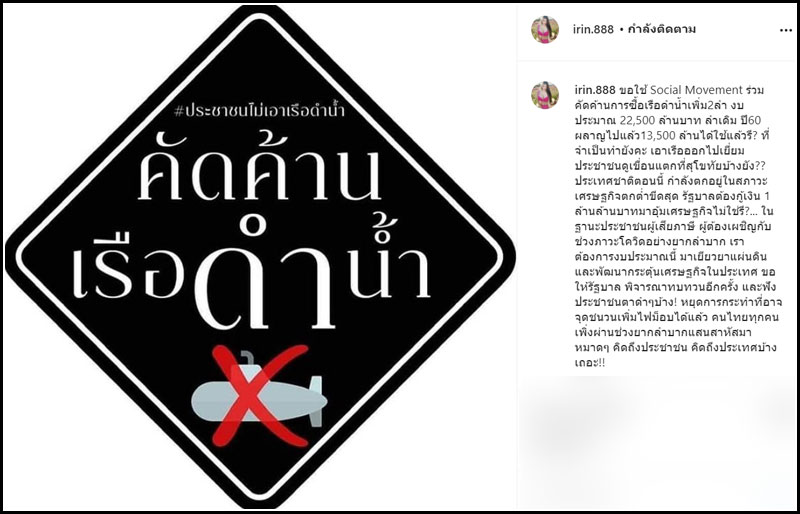 25 สิงหาคม 2563 จากกรณีงบประมาณการซื้อเรือดำน้ำ 2 ลำ 22,500 ล้านบาท ทำให้เกิดกระแสวิพากษ์วิจารณ์ ล่าสุด เปิ้ล ไอริณ นักแสดงสาวก็ขอแสดงความคิดเห็นเกี่ยวกับเรื่องนี้ว่า