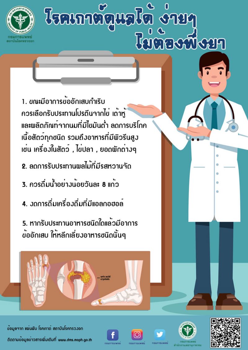 กรมการแพทย์ โดยสถาบันโรคทรวงอก แนะปรับเปลี่ยนพฤติกรรมเกี่ยวกับการรับประทานอาหารและเครื่องดื่มสามารถช่วยลดอาการข้ออักเสบที่เป็นสาเหตุทำให้เกิดโรคเกาต์ได้