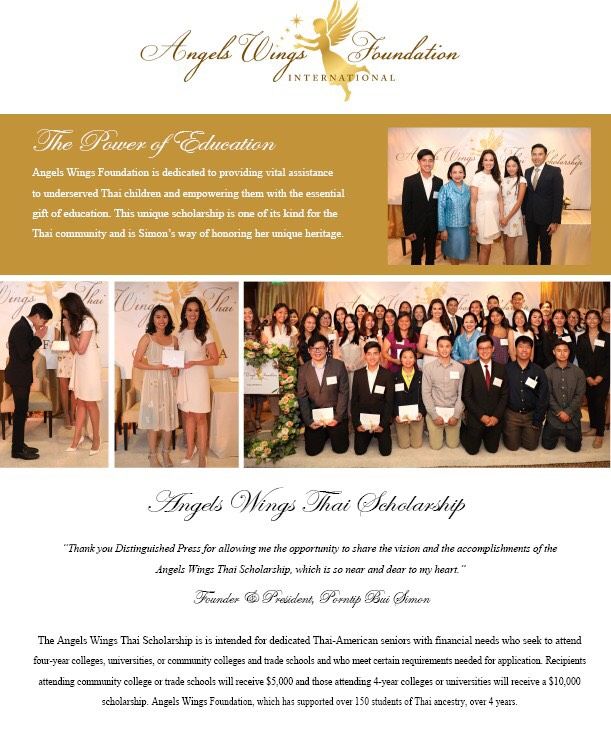 ตั้งแต่ปี 2017 มูลนิธิแองเจลส์ วิงส์ได้มอบโอกาสทางการศึกษาให้แก่เยาวชนไทยในสหรัฐอเมริกา โดยมีวัตถุประสงค์เพื่อยกย่องนักเรียนไทย-อเมริกันที่มีผลการเรียนดีเด่น อยู่ในกลุ่มคอมมูนิตี้ชาวไทย และมีความประสงค์ที่จะศึกษาต่อ ผู้ที่ได้รับเลือกจะได้รับทุนการศึกษา 5,000 ดอลล่าร์สหรัฐ สำหรับการศึกษาเล่าเรียนวิทยาลัยในเมืองหรือชุมชน หรือ ทุนการศึกษา 10,000 ดอลล่าร์สหรัฐ สำหรับค่าเรียน 4 ปีในมหาวิทยาลัย