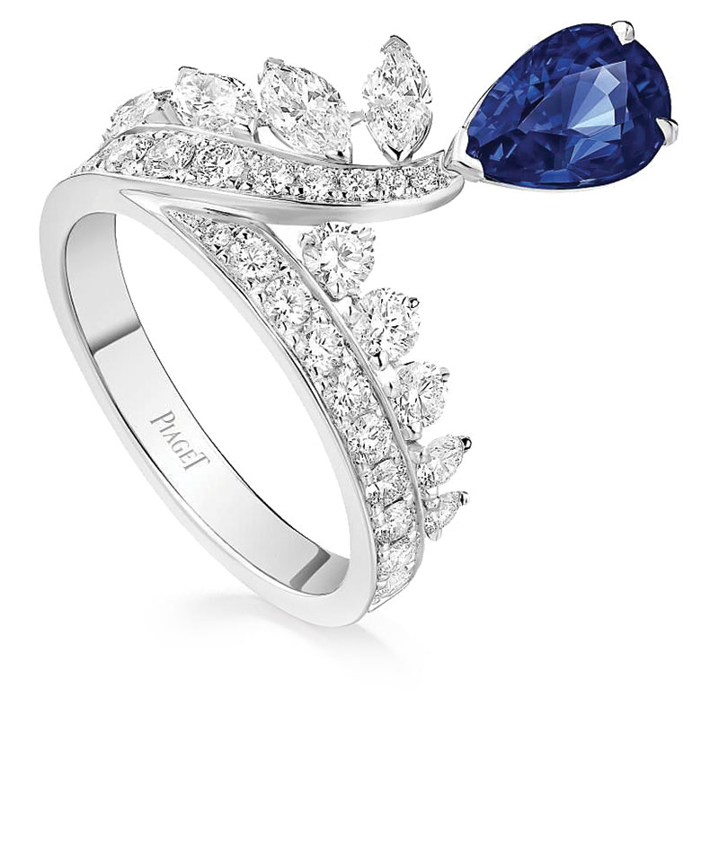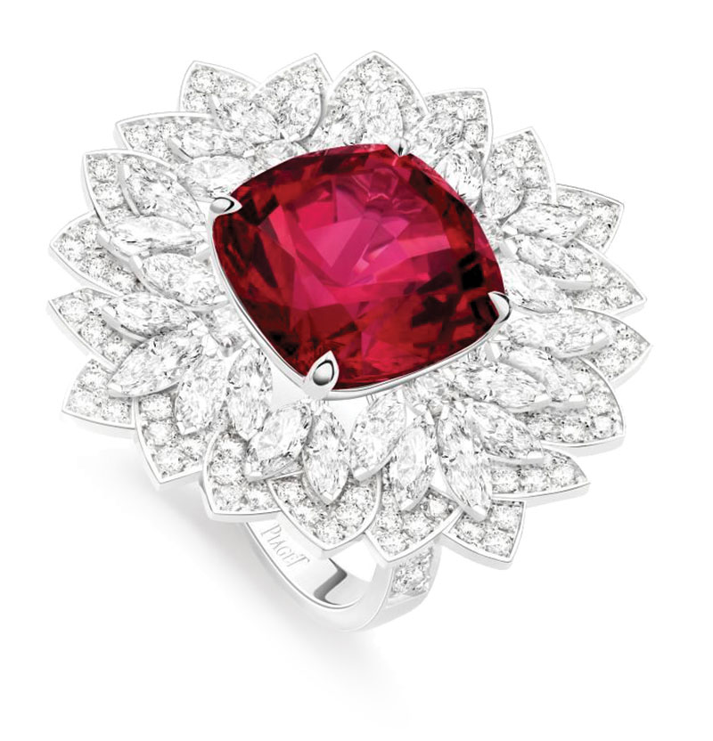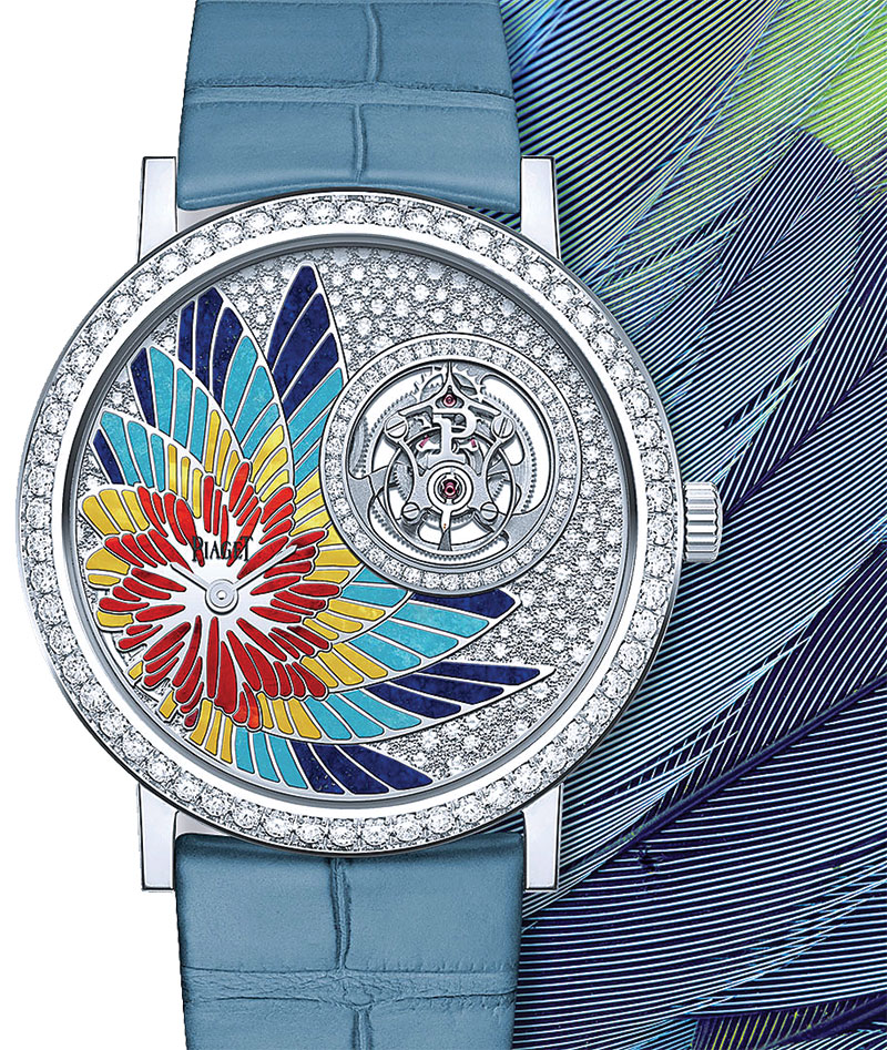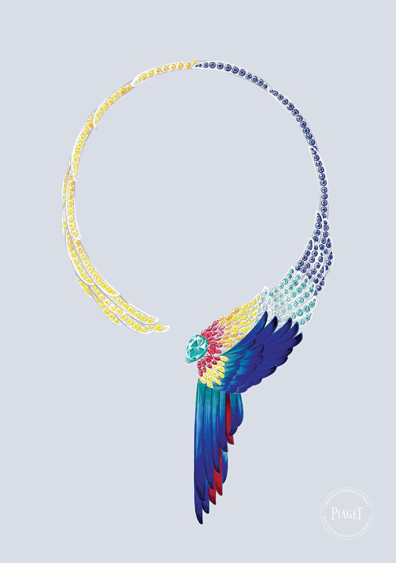 ต่อด้วย MAJESTIC PLUMAGE EARRINGS ต่างหูตัวเรือนไวท์โกลด์ 18 กะรัต ประดับสปิเนลหายากโทนสีแดงอมชมพู ทรงลูกแพร์ขนาด 2.70 กะรัต จากแทนซาเนีย และแซฟไฟร์หลากสี MAJESTIC PLUMAGE RING แหวนตัวเรือนไวท์โกลด์ 18 กะรัต ประดับ Indicolite tourmaline ที่มีโทนสีเข้มกว่าน้ำเงินแกมเขียวของทัวร์มาลีนทั่วไป และสปิเนลสีชมพูทรงลูกแพร์ นอกจากนี้แล้วยังมี VIBRANT PLUMAGE WATCH นาฬิกาตัวเรือนไวท์โกลด์ 18 กะรัต ประดับเพชร โดดเด่นด้วยเหล่าหินสีแกะสลัก ที่มาแต่งแต้มสีสันในลวดลายขนนก จับคู่สายหนังจระเข้สีฟ้า รังสรรค์โดย Dick Steenman ผลิตจำกัดเพียง 8 เรือน เท่านั้น