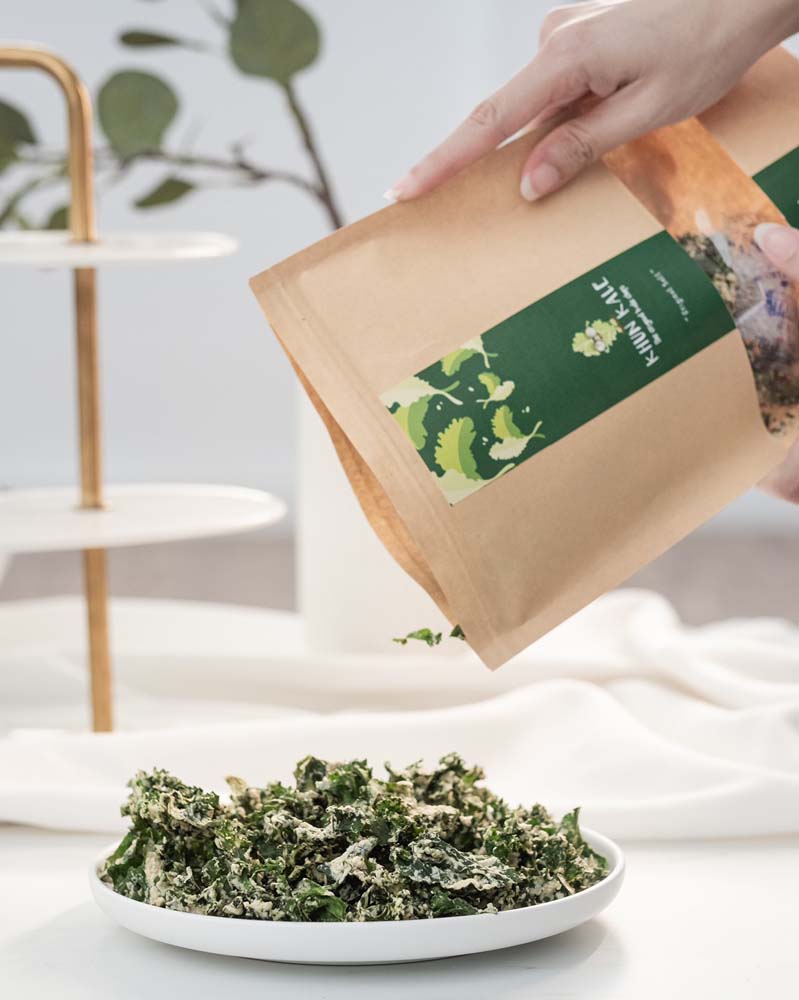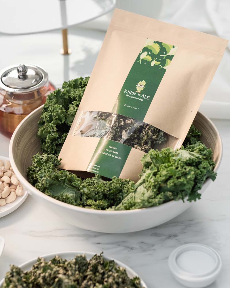 ทานแล้วจะไม่รู้สึกว่าทานผักอยู่ ที่สำคัญผักเคลเป็น Super Food ติดอันดับท็อป 10ของโลก โดยที่มีฉายาว่าราชินีของผัก ผักเคลอุดมไปด้วยวิตามินและสารอาหารมากมาย ซึ่งสามารถลดคอเลสเตอรอลและระดับนํ้าตาลในเลือดได้ เป็นต้น ในขณะเดียวกันขบวนการผลิตที่เราใช้ ทำให้ไม่สูญเสียวิตามินและสารอาหาร การทานขนม Khun Kale หนึ่งถุง เราจะได้รับ วิตามินเค 220% วิตามินเอ 100%วิตามินซี 45% โปรตีน 7 กรัม และ ไฟเบอร์4 กรัม จากปริมาณสารอาหารที่แนะนำให้คนไทยบริโภคต่อวันตอบโจทย์ Lifestyle ของคนที่อยากดูแลตัวเอง เพราะ Khun Kale ทานง่าย พกพาง่าย ทานถุงเดียว…จบ