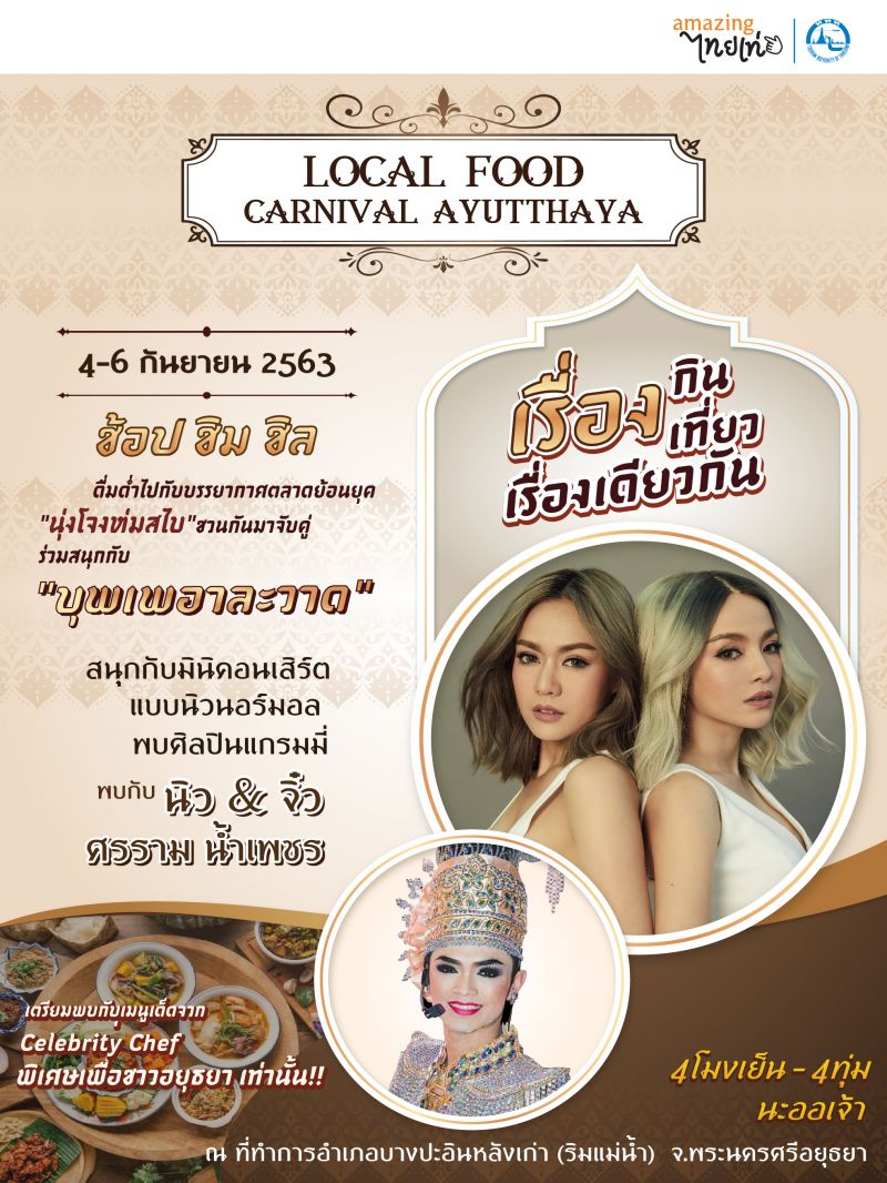 ขอเชิญเที่ยวงาน “Local Food Carnival Ayutthaya “ภายในงานมีกิจกรรมมากมาย อาทิ…กิจกรรม ช้อป ชิม ชิลดื่มด่ำไปกับบรรยากาศตลาดย้อนยุค กับร้านอาหารจาก Fin Market และ ร้านอาหารขึ้นชื่อในท้องถิ่น เพื่อเป็นการกระจายรายได้เข้าสู่ชุมชน ส่งเสริมการท่องเที่ยวในประเทศไทย