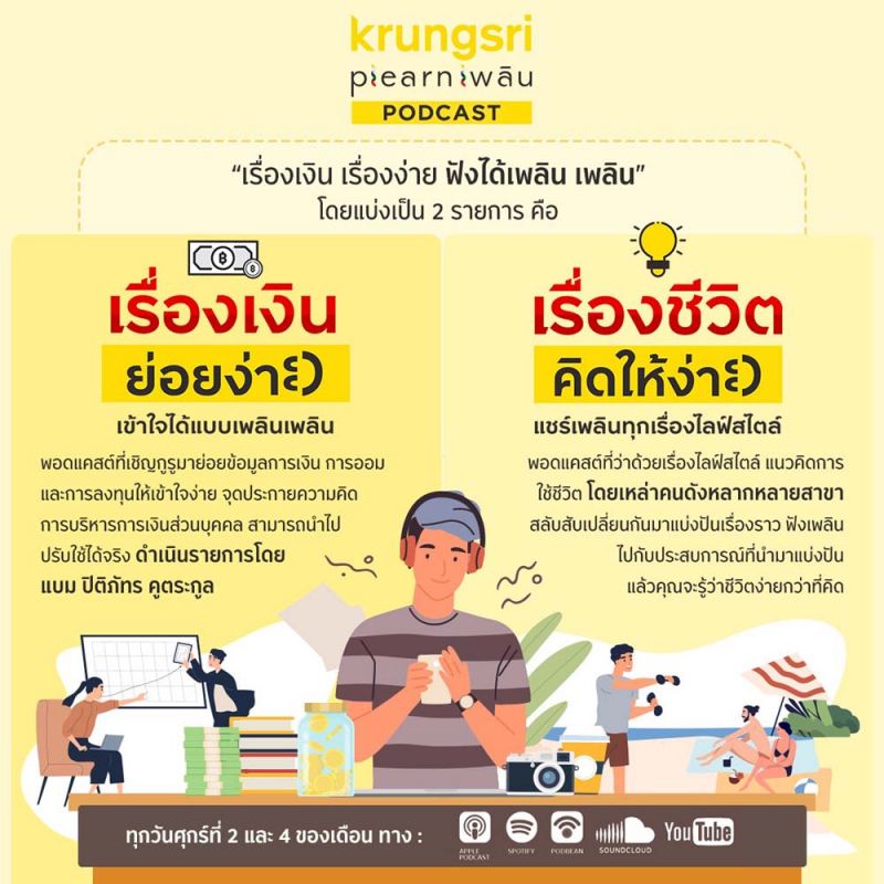 ล่าสุด กรุงศรีได้เปิดตัว “Krungsri Plearn เพลิน PODCAST” ภายใต้แนวคิด “เรื่องเงินเรื่องง่าย ฟังได้เพลิน เพลิน” เพื่อเป็นทางเลือกให้ลูกค้าได้รับสาระความรู้พร้อมความบันเทิงได้ง่ายๆ แทนการอ่าน เข้ากับไลฟ์สไตล์คนเมืองรุ่นใหม่ที่ส่วนใหญ่จะเป็นการฟังระหว่างการเดินทางไปกลับที่ทำงาน (ขับรถหรือโดยสารขนส่งสาธารณะต่างๆ) ระหว่างการออกกำลังกาย หรือแม้แต่การใช้เวลาให้เป็นประโยชน์ขณะกำลังทำกิจกรรมต่างๆ โดยแบ่งเป็น 2 รายการ คือ (1) เรื่องเงิน ย่อยง่าย : พอดแคสต์ที่เชื้อเชิญกูรูมาย่อยข้อมูลความรู้ด้านการเงิน การออม และการลงทุนให้เข้าใจง่ายๆ เน้นเพิ่มทักษะเรื่องการเงิน หรือจุดประกายความคิดในการบริหารการเงินส่วนบุคคล ฟังเพลิน เข้าใจง่าย และสามารถนำไปปรับใช้ได้ ดำเนินรายการโดย แบม ปิติภัทร คูตระกูล ซึ่งกูรูคนแรกที่ได้มาพูดคุยกันเมื่อวันศุกร์ที่ 14 สิงหาคม ที่ผ่านมา คือ ดร.สมประวิณ มันประเสริฐ หรือ ดร.เม่น ผู้บริหารสายงานวิจัยและหัวหน้าทีมเศรษฐกิจ ธนาคารกรุงศรี (2) เรื่องชีวิต คิดให้ง่าย : พอดแคสต์ที่ว่าด้วยเรื่องไลฟ์สไตล์ แนวคิดการใช้ชีวิต การท่องเที่ยว โดยมีเหล่าคนดังหลากหลายสาขาและยูทูบเบอร์ที่จะสลับสับเปลี่ยนกันมาแบ่งปันเรื่องราวที่น่าสนใจ ที่แฝงด้วยสาระ ผู้ฟังได้สนุก ฟังเพลินไปกับประสบการณ์ของผู้เล่าที่นำมาแบ่งปันให้ฟัง แล้วคุณจะรู้ว่าชีวิตง่ายกว่าที่คิด เริ่มต้นตอนแรกวันที่ 28 สิงหาคม ที่ผ่านมา กับ เรื่องราวสร้างแรงบันดาลใจ จาก “นิ้วกลม” สราวุธ เฮ้งสวัสดิ์