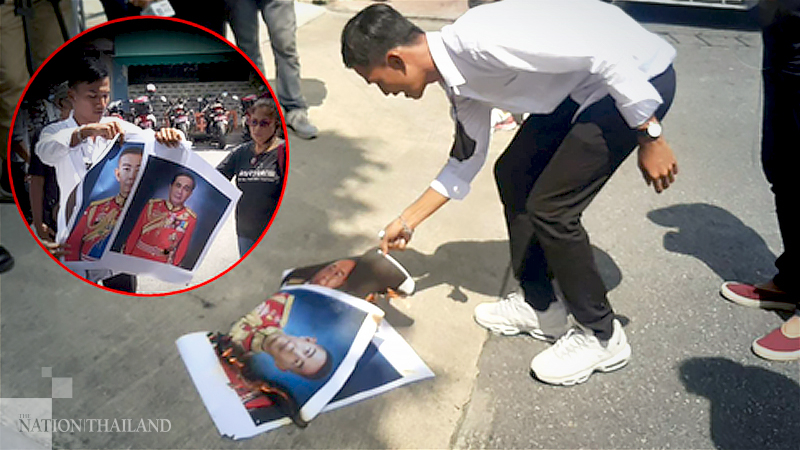 A prominent pro-democracy activist burned images of Prime Minister Prayut Chan-o-cha, Deputy PM Prawit Wongsuwan and Army chief Apirat Kongsompong as he visited a police station this morning to acknowledge charges.