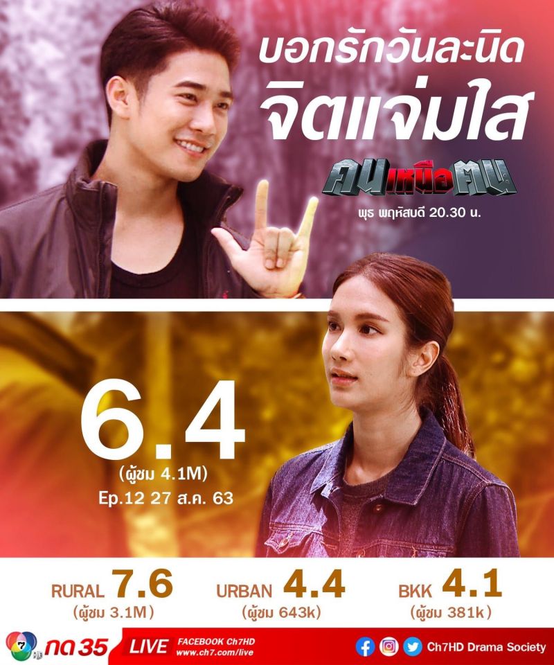 ต่อกันที่วันพุธ-พฤหัสบดี กับละคร คนเหนือฅน นำแสดงโดย ยูโร-ยศวรรธน์ และ เนย-ปภาดา ผลิตโดยค่ายโคลีเซี่ยมฯ ซึ่งเป็นละครบู๊แอ๊กชั่นหักเหลี่ยมเฉือนคมที่โกยเรตติ้งขึ้นทุกอีพี ล่าสุด (27 สิงหาคม 63) ทำเรตติ้งสูงถึง 6.4 เรียกว่ามาเหนือสมชื่อละครจริง ๆ แฟนบู๊รอติดตามฉากสุดท้ายได้ในวันที่ 10 กันยายน นี้