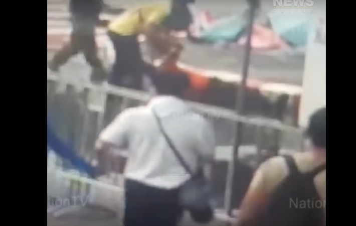 A video recorded by a CCTV camera showed that a street sweeper was assaulted by a man in a black jacket during the royalist rally at Bangkok’s Dindaeng Thai-Japanese Stadium.