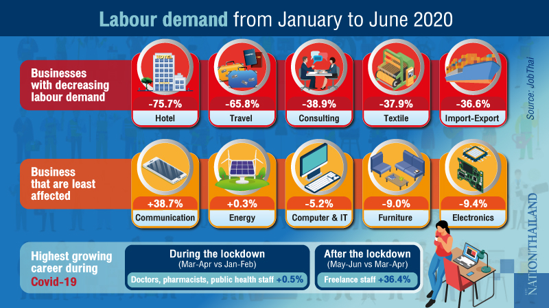 JobThai also reported that sectors with the highest demand for new employees during Covid-19 are food and beverages, as people still need basic necessities despite the outbreak, while the sector that saw the biggest drop in employment of up to 75.7 per cent, were tourism-related due to lack of foreign tourists and lockdown measures in Thailand and other countries.