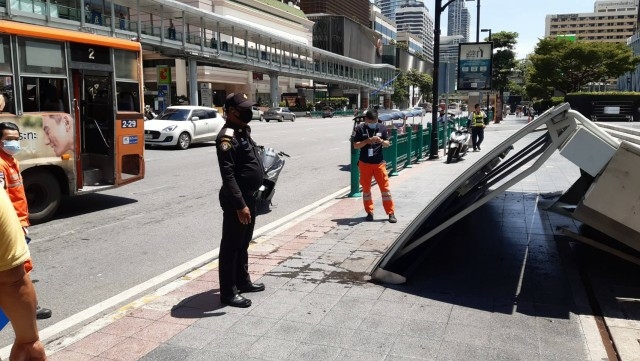The bus shelter appeared to have collapsed because its structure was rusty and damaged although it had been repaired periodically. Bangkok Metropolitan Administration (BMA) officials removed the collapsed bus shelter and set up a tent on Saturday.