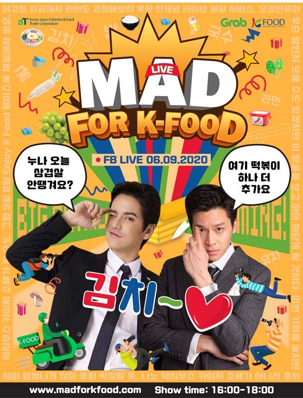 สิ้นสุดการรอคอยกับงาน live อีเว้นท์ครั้งแรกของประเทศไทยที่เพิ่งจบลงไปเมื่อวันอาทิตย์ที่ 6 กันยายนที่ผ่านมา กับงาน “Mad for K-Food” Facebook and Zoom Live Streaming โดยมีสองหนุ่มนักแสดงคู่ซี้สุดฮอตอย่าง มาร์ช จุฑาวุฒิ และ เต๋า เศรษฐพงศ์ มาร่วมสร้างสีสันและความสนุกสนานผ่านกิจกรรมต่างๆในงาน ซึ่งได้รับเสียงตอบรับจากท่านผู้ชมและแฟนคลับอย่างล้นหลาม และของรางวัลอาหาร K-Food มากมายที่ได้มอบให้กับผู้ร่วมกิจกรรมกว่า 300 รางวัล และด้วยบริการขนส่งที่รวดเร็วจาก Grab ขนส่งของรางวัลสุดพิเศษจากสองหนุ่ม อีกทั้งอาหาร K-Food และส่วนลดต่างๆไปมอบให้แก่ท่านผู้ชมถึงที่บ้านแบบเรียลไทม์