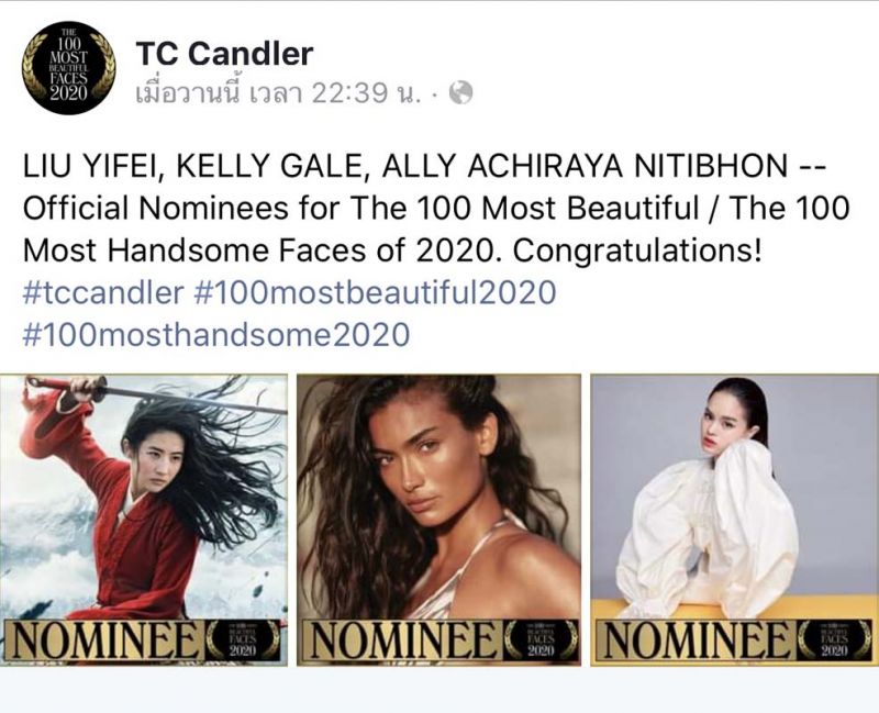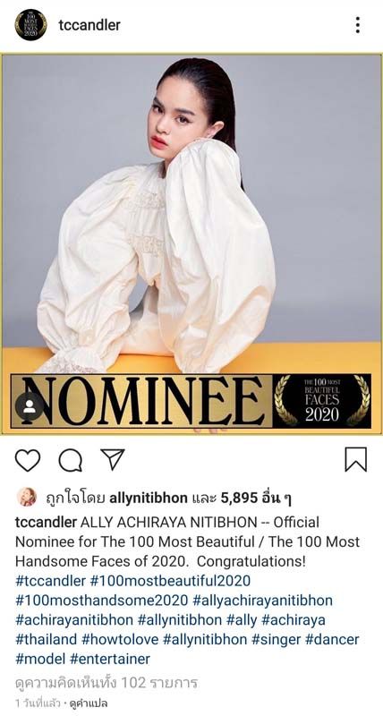 ทว่าล่าสุด! ชื่อและหน้าตาของ แอลลี่ (ALLY) – อชิรญา นิติพน ไปปรากฏอยู่บนอินสตาแกรมของ TC Candler สื่อออนไลน์วิจารณ์อิสระชื่อดัง ในฐานะผู้เข้าชิงอย่างเป็นทางการในการจัดอันดับ “THE 100 MOST BEAUTIFUL FACES OF 2020” ซึ่งจะประกาศผลในช่วงปลายปีนี้ โดยโพลล์ดังกล่าวได้ทำการจัด 100 อันดับเหล่าคนดังที่มีใบหน้าสวย/หล่อที่สุดของโลกมาอย่างต่อเนื่องตั้งแต่ปี 1990 และได้รับความสนใจจนเป็นกระแสฮือฮาทุกปีเลยก็ว่าได้ แฟนคลับแอลลี่ไปร่วมด้วยช่วยโหวตกันได้ที่ https://www.instagram.com/p/CEz_LOPnwuZ