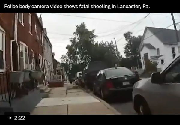 Video from the officer’s body camera, released by the Lancaster County district attorney’s office, shows a woman exiting a building as the officer asks, “Where did he go?” The suspect then rushes out of the building and the officer starts to run, before shooting at the man several times.