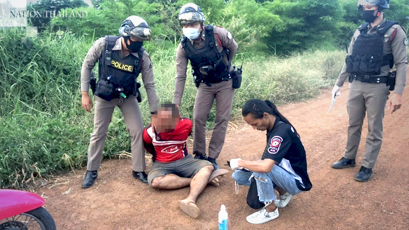 Uthai Thani police arrested a man for trying to attack his mother with a knife on Thursday (September 17) before holding himself hostage.