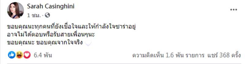 ล่าสุด ซาร่า คาซิงกินี ได้โพสต์เฟซบุ๊ก ระบุว่า ขอบคุณนะทุกคนที่ยังเชื่อใจและให้กำลังใจซาร่าอยู่ อาจไม่ได้ตอบหรือรับสายเพื่อนๆ นะ ขอบคุณนะ ขอบคุณจากใจจริง ขณะที่หลังโพสต์ชาวเน็ตเข้ามาคอมเมนต์กันแบบถล่มทลาย