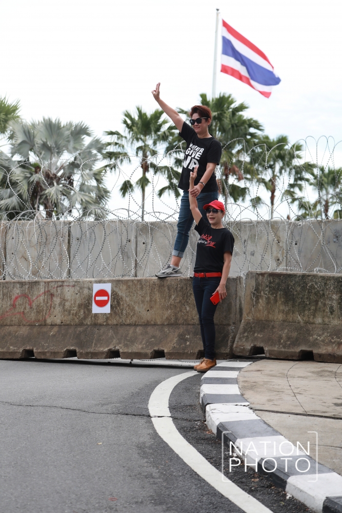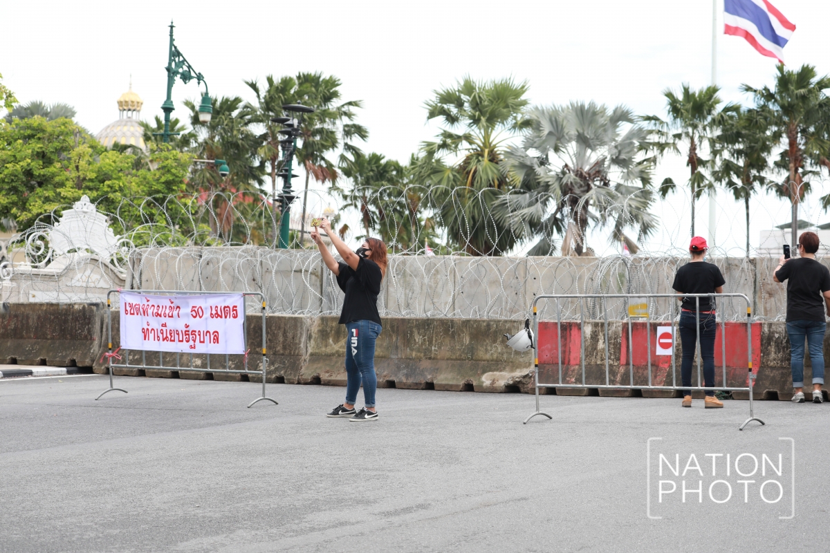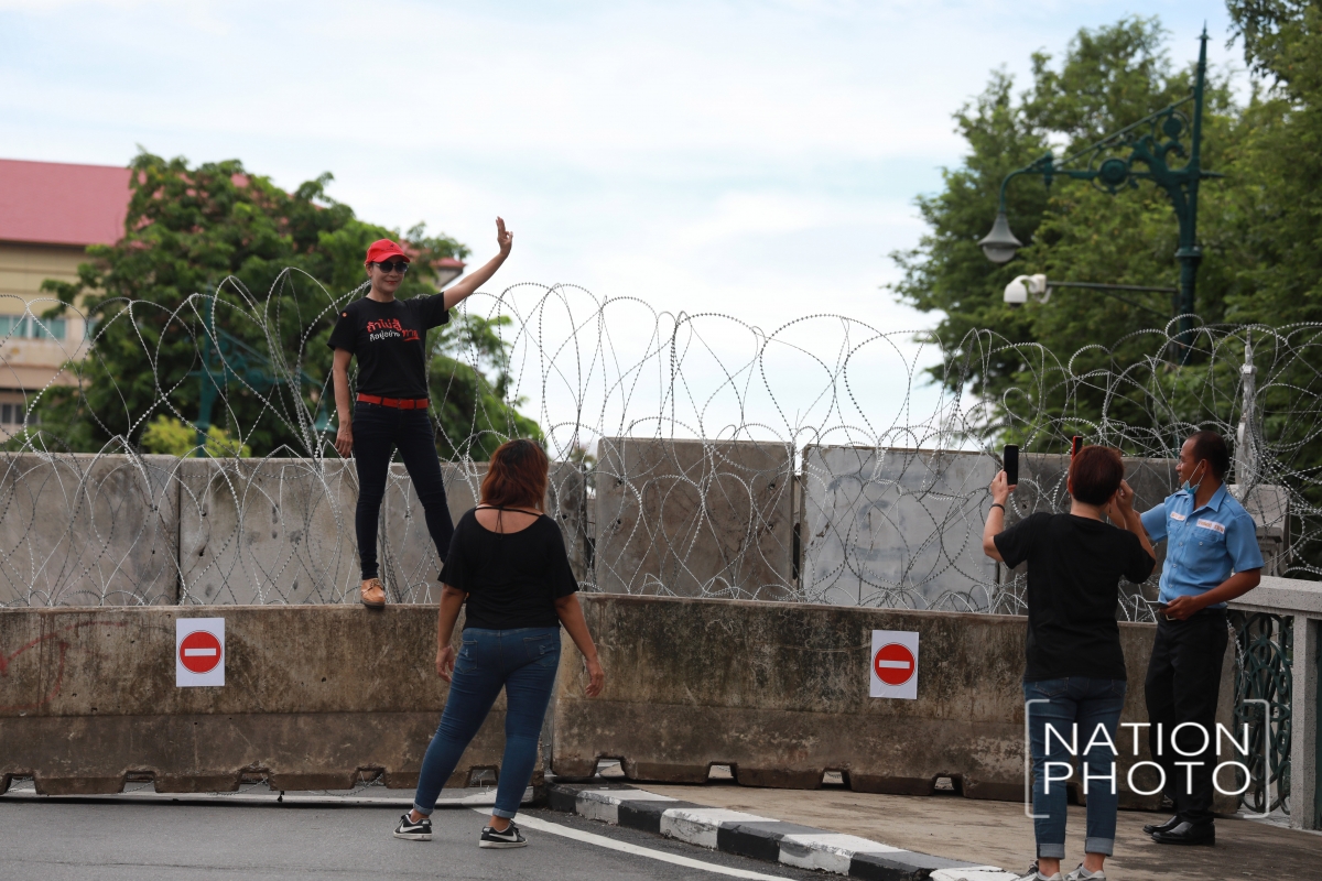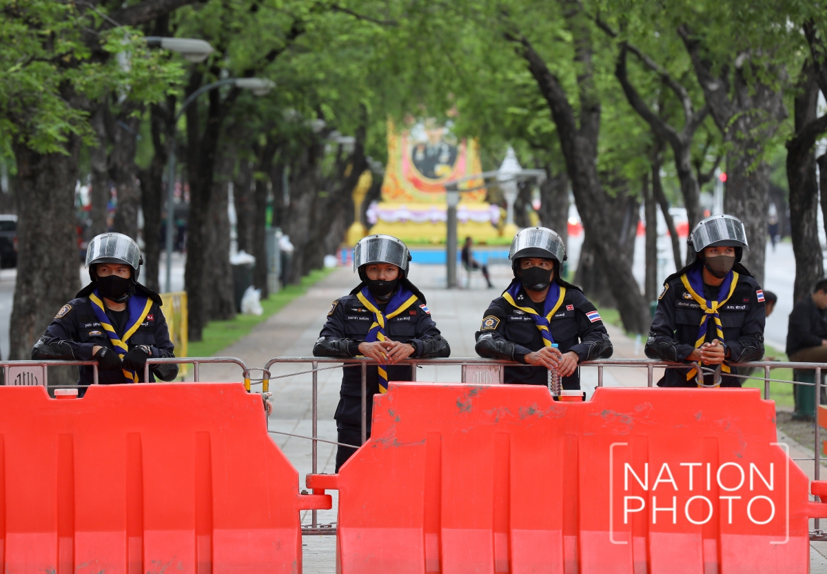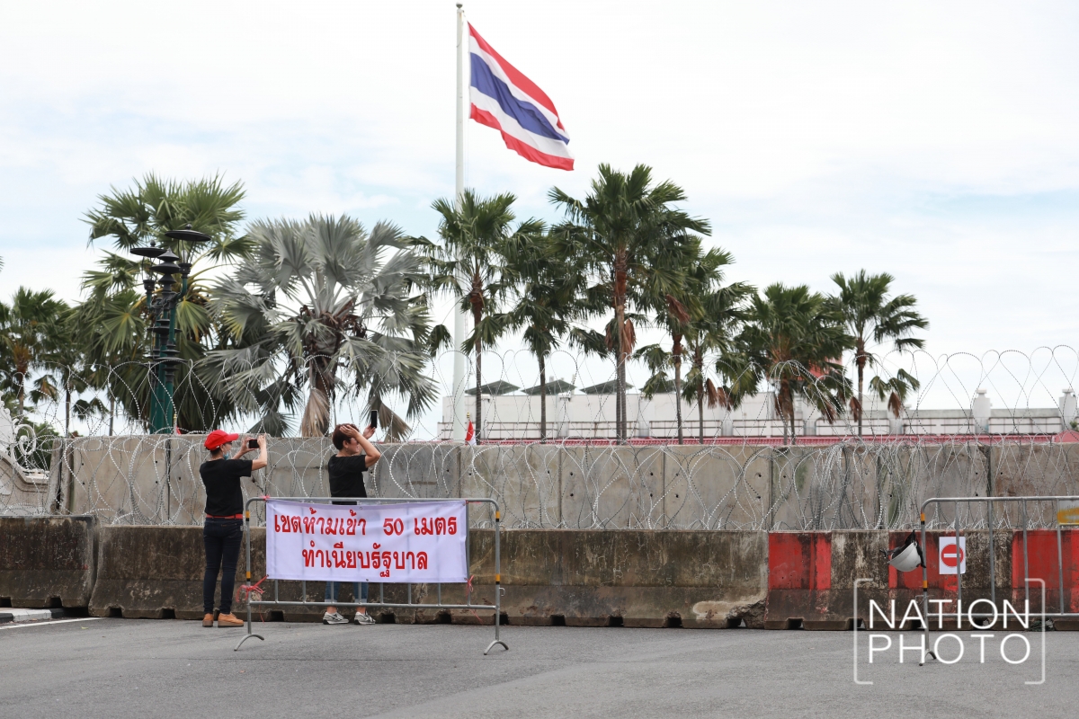 Barriers had been built around Government House and other government buildings since 5am Sunday to prevent protesters from invading the complex or removing the ultraroyalist plaque at the Royal Plaza in Dusit district.