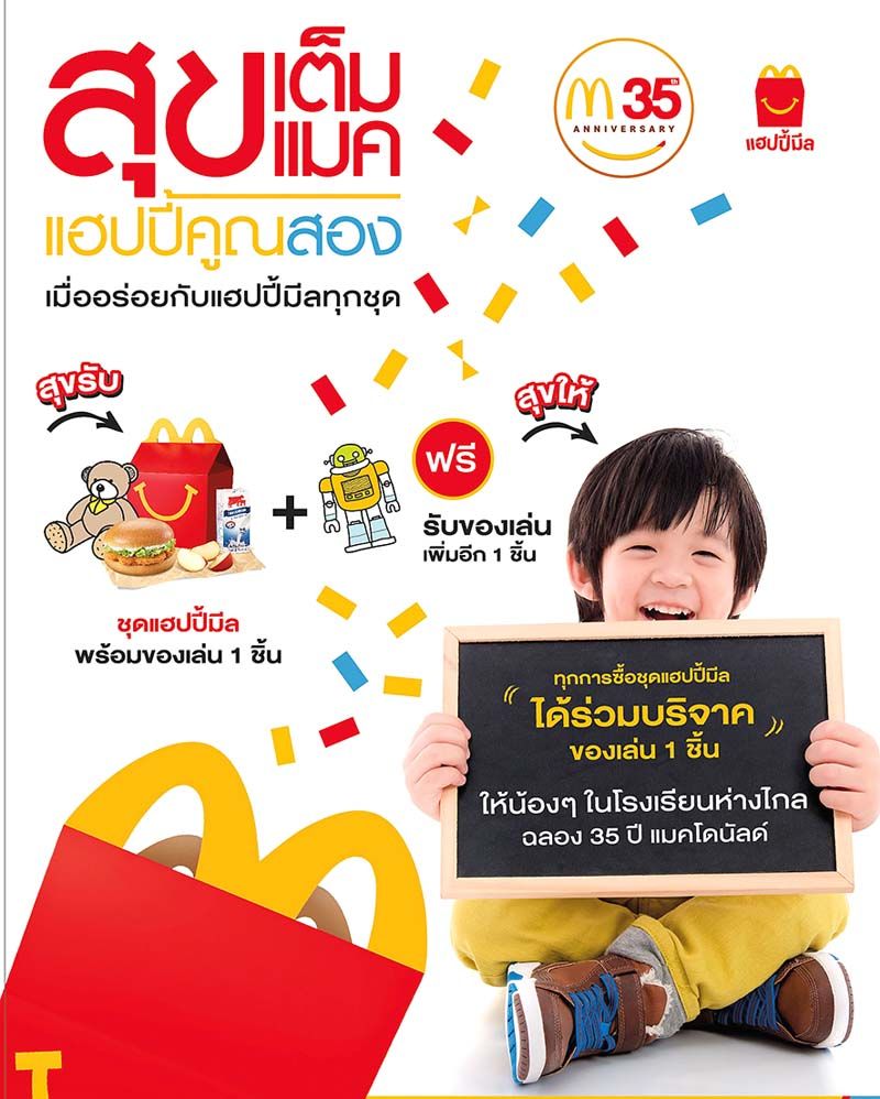 บริษัท แมคไทย จำกัด ผู้ดำเนินธุรกิจอาหารบริการด่วนภายใต้แบรนด์แมคโดนัลด์ในประเทศไทย ฉลองครบรอบ 35 ปี แห่งความผูกพันที่ไม่เคยเปลี่ยนแปลงของผู้บริโภคกับแมคโดนัลด์ประเทศไทย จัดแคมเปญ “สุขเต็มแมค แฮปปี้คูณสอง” ชวนลูกค้าทำความดีแบ่งปันความสุขและรอยยิ้ม โดยร่วมบริจาคของเล่นให้กับน้องๆ ในโรงเรียนตำรวจตระเวนชายแดน 218 แห่งทั่วประเทศ