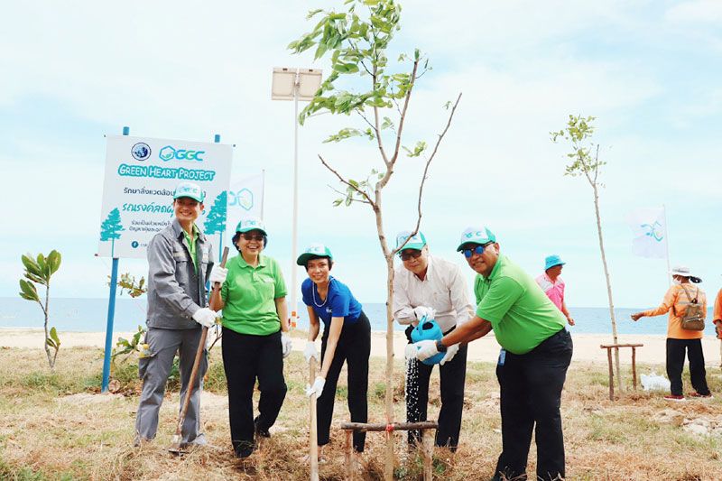 GGC ในฐานะผู้นำผลิตภัณฑ์เคมีเพื่อสิ่งแวดล้อมและเป็น Green Flagship ของกลุ่ม GC มีโรงงานตั้งอยู่ที่จังหวัดระยอง เรามีความห่วงใยต่อสถานการณ์ดังกล่าวมาโดยตลอดและมีนโยบายส่งเสริมการลดฝุ่น PM2.5 ในระยะยาว จึงได้ริเริ่มโครงการ “Green Heart Project” ขึ้นเพื่อรณรงค์ให้ความรู้สร้างความเข้าใจเกี่ยวกับ PM2.5 และแนวทางการปฏิบัติตัวแก่ผู้บริหาร พนักงาน และชุมชนโดยรอบเขตพื้นที่การผลิตเพื่อป้องกันตนเองในการเผชิญกับสถานการณ์ดังกล่าว อีกทั้ง GGC ยังมีมาตรการส่งเสริมการใช้เชื้อเพลิงชีวภาพ “ไบโอดีเซล” เพื่อช่วยลดการปล่อยก๊าซคาร์บอนไดออกไซด์(CO2) จากการเผาไหม้ของเครื่องยนต์ดีเซลและลดการปล่อยมลพิษทางอากาศ PM2.5 ที่จะมาส่งผลกระทบต่อพี่น้องประชาชน และขอร่วมเป็นส่วนหนึ่งในการดูแลสุขภาพและบรรเทาปัญหาฝุ่นละอองในประเทศไทยด้วยการปลูก “ต้นราชพฤกษ์” เพื่อช่วยเติมเต็มพื้นที่สีเขียวกว่า 10 ไร่ ณ บริเวณชายหาดพยูน ให้ร่มเงา เพิ่มออกซิเจนและเปรียบเสมือนเครื่องฟอกอากาศจากธรรมชาติที่จะมาช่วยยกระดับคุณภาพชีวิตและคืนอากาศที่บริสุทธิ์ให้กับประเทศไทยอย่างยั่งยืน โดยต้นไม้ที่นำมาปลูกในครั้งนี้ ยังสามารถขึ้นทะเบียนต้นไม้เพื่อวัดผลการลดPM2.5 ได้อย่างเป็นรูปธรรม