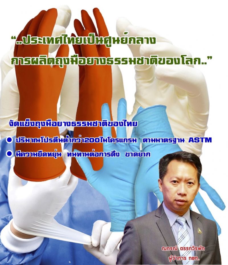 ทั้งนี้ อุตสาหกรรมการผลิตถุงมือยางที่มีอัตราการเติบโตอย่างต่อเนื่อง 12-15% ในทุกปี มีมูลค่าการส่งออกประมาณ 37,000 ล้านบาทต่อปี โดยมีประเทศมาเลเซียเป็นผู้ผลิตถุงมือรายใหญ่ที่สุดของโลกครองส่วนแบ่งทางการตลาด 60% ประเทศไทยเป็นอันดับ 2 มีส่วนแบ่งทางการ 15% อย่างไรก็ตาม ล่าสุด กยท.ได้บูรณาการกับหน่วยงานที่เกี่ยวข้องที่จะร่วมกันผลักดันให้ประเทศไทยเป็น “Hub of Natural Rubber Glove” โดยประกาศจุดยืน “ประเทศไทยเป็นศูนย์กลางการผลิตถุงมือยางธรรมชาติของโลก”
