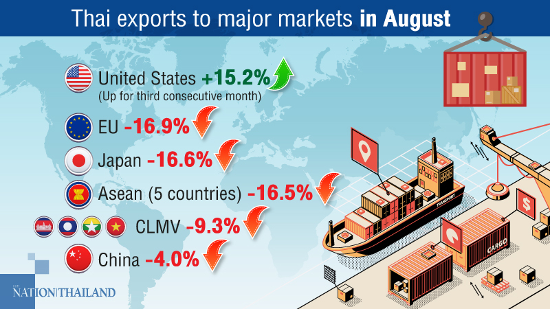 Thai exports fell by a smaller than expected 7.94 per cent to US$20.21 billion in August from a year earlier, the Commerce Ministry said on Wednesday.