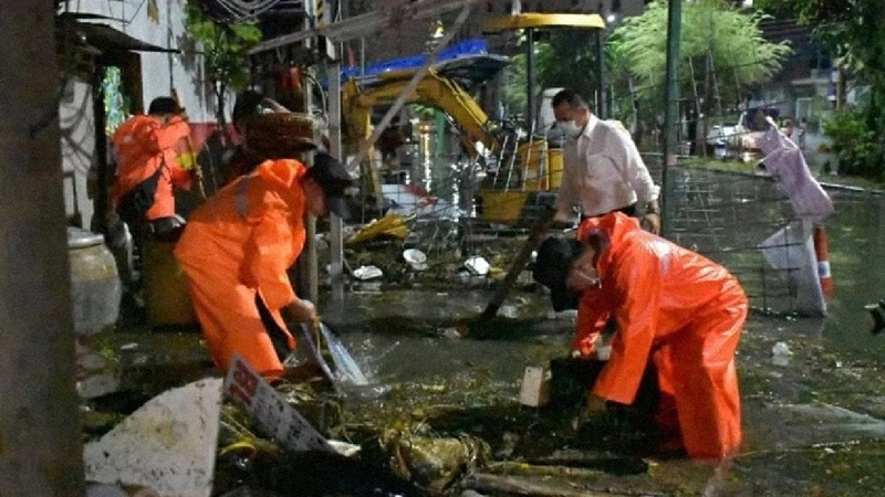 In Huai Khwang district, officials had to drain the floodwater with two pumps, while taking out a big amount of trash which was blocking the water flow.