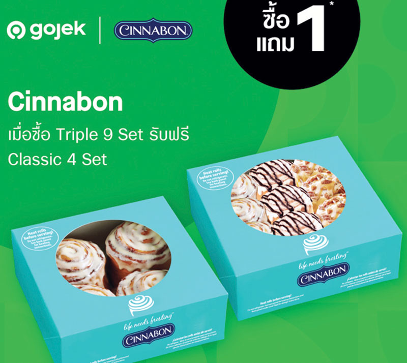 “ซินนาบอน” ชวนชิมขนมอบ พร้อมโปรโมชั่น “Cinnabon x Gojek Grand Opening Deal” ซื้อเซตทริปเปิลไนน์ 9 ชิ้น 1 กล่อง ราคาเริ่มต้น329 บาท รับเซตซินนาบอนคลาสสิก4 ชิ้น 1 กล่อง มูลค่า 225 บาทฟรี!อิ่มคุ้มโดนใจ ผ่านแอพฯ Gojek ถึง 4 ต.ค.ที่ ร้านซินนาบอน ทุกสาขา