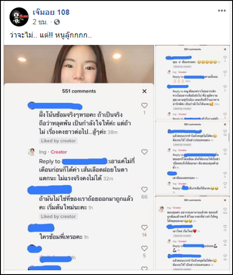 โดยเพจ เจ๊มอย 108 ก็ได้เผยภาพข้อความของ น้องอิงอิง ที่ถูกแชร์สนั่นในโลกออนไลน์ โดยข้อความดังกล่าวอ้างว่า ” เคยโดนซ้อมเย็บ 14 เข็ม เส้นเลือดฝอยในตาแตก”
