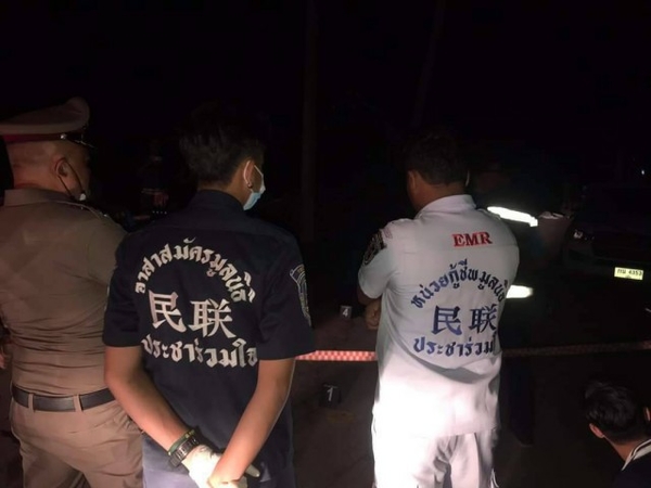When officers from Thamphanra Police Station reached the crime scene, they found the bodies of Narongrit Thepthong, aged 32, and Khanchit Somwong, 47, lying on the ground with multiple gunshot wounds. They also found an injured person named Sathaporn Somwong, 25, with a gunshot wound to his chest. He was rushed to hospital where his condition was still critical.