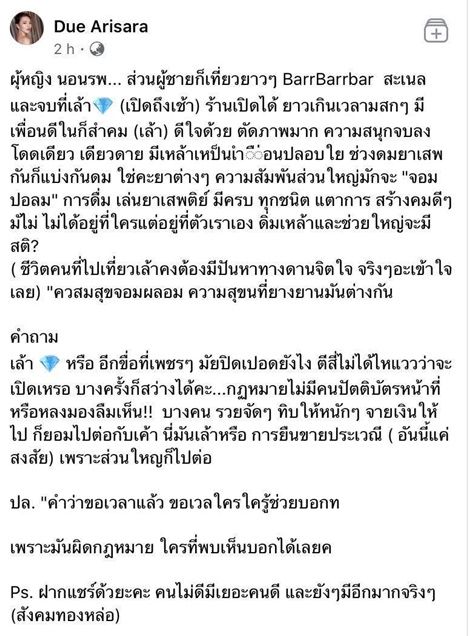 29 ก.ย.63 ทำเอาหลายคนงงไปตามๆ กัน เมื่อนักแสดงสาว “ดิว อริสรา ทองบริสุทธิ์” ออกมาโพสต์ข้อความแปลกๆ พูดถึงสังคมทองหล่อ-เอกมัยจอมปลอม การเที่ยวเลานจ์ การใช้สารเสพติด ไม่ปฏิบัติตามกฎหมาย คนรวยๆ ทิปหนัก ก็ยอมไปด้วย นี่มันเลานจ์ หรือยืนขายประเวณี