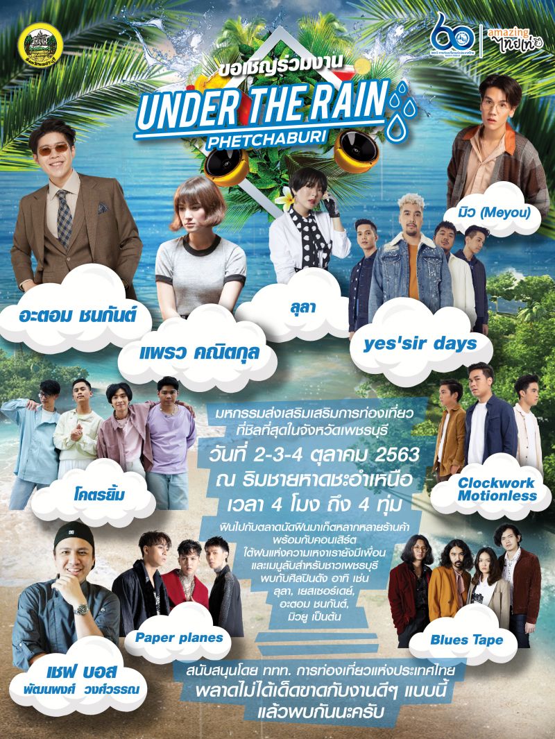 มาสนุกใต้สายฝน ถึงฝนตกก็ไม่ต้องกลัวเหงา เพราะเรามีเพื่อน และพบเมนูลับสำหรับชาวเพชรบุรีโดยเฉพาะ ในงาน “Under the Rain Phetchaburi”ใต้ฝนแห่งความเหงาเรายังมีเพื่อนโดยได้ ททท. การท่องเที่ยวแห่งประเทศไทย เป็นผู้สนับสนุนการจัดงานครั้งนี้กิจกรรมในรูปแบบของการมีส่วนร่วมกับชุมชนวิถีชีวิตท้องถิ่นแบบฉบับไทย ที่มีความน่าสนใจ โดดเด่น ดึงดูดนักท่องเที่ยวและส่งเสริมการท่องเที่ยวของประเทศไทย และพบกับกิจกรรมมากมาย อาทิ Fin Market ตลาดนัดสายครีเอทีฟที่มีอาหารและสินค้าในสไตล์ชิคๆชิลชิลให้ช้อปกันอย่างเต็มพิกัด,Chef On The Beach สร้างสรรค์โดย Celebrity Chef ปรุงอาหารจานใหม่โดยใช้วัตถุดิบท้องถิ่นโชว์การปรุงอาหารเมนูคิดค้นขึ้นมาใหม่ เพื่อมอบให้เป็นเมนูประจำจังหวัดเพชรบุรี พร้อมทั้งยังมีการ LIVE สดผ่านทางแฟนเพจfacebookที่มีชื่อว่า Under the Rain Phetchaburi, การแข่งขันกินจุอาหารขึ้นชื่อของจังหวัดเพชรบุรีชิงรางวัล, ประกวดถ่ายภาพชุดกันฝน ชิงของรางวัล และรับชมคอนเสิร์ตจากศิลปินดังทุกวันมากมายหลายวงอัดแน่นกันทุกวัน ไม่ว่าจะเป็น ลุลา, แพรว คณิตกุล, อะตอม ชนกันต์,Meyou(มิวยู), โคตรยิ้ม,Yes’sir days, Paper planes, Blue tape และClockwork Motionless