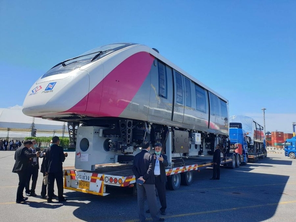 Prime Minister Prayut Chan-o-cha took delivery of the bogeys for the new MRT Yellow and Pink lines in a ceremony at Chonburi’s Laem Chabang port on Thursday.