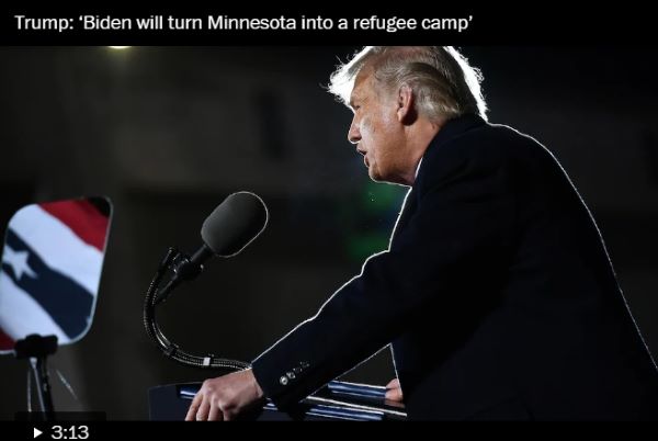 The president told supporters that Biden “will turn Minnesota into a refugee camp, overwhelming public resources, overcrowding schools and inundating your hospitals,” by bringing foreigners “from the most dangerous countries in the world, including Yemen, Syria, and your favorite country, Somalia.”
