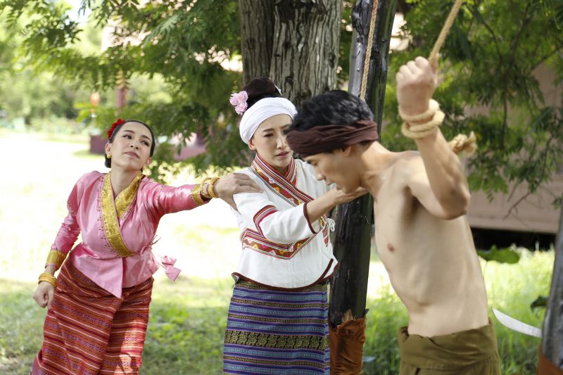 เป็นฉากที่ ขุนงาย(ณัฏฐ์ เทพหัสดิน ณ อยุธยา)ถูกทหารจับถอดเสื้อแล้วก็มัดเข้ากับเสา ม่านฟ้า(มิ้นท์-ณัฐวรา) ยิ้มเยาะที่แผนการของขุนงายไม่สำเร็จและสั่งให้ทหารเฆี่ยนขุนงาย เกษแก้ว(ปาย สิตางศุ์)รีบเข้ามาขวาง ม่านฟ้าไม่พอใจตบเกษแก้วจน ศรีออนกับจันทน์ผารีบมาดูเหตุการณ์ จันทน์ผา(เบนซ์-ปุณยาพร)สั่งศรีออนให้ไปช่วย ขุนงานม่านฟ้าไม่ยอมด่ากราดจนจันทร์ผาเข้าไปตบหน้าม่านฟ้าเพื่อเรียกสติ