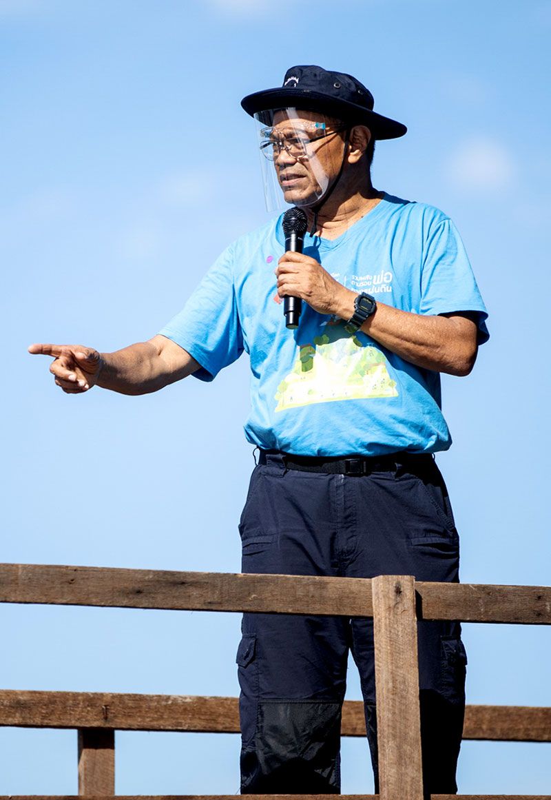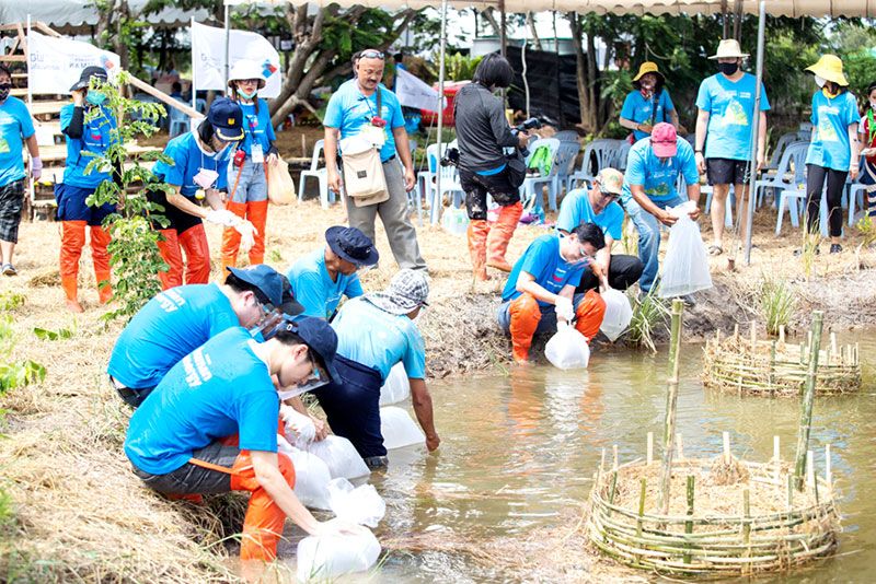 โครงการ “พลังคนสร้างสรรค์โลก รวมพลังตามรอยพ่อของแผ่นดิน” ปีที่ 8 จัดกิจกรรมเอามื้อสามัคคี ระดมอาสาสมัครเกือบ400 คน สร้างพื้นที่ต้นแบบโคก หนอง นาขาวัง แบบกสิกรรมธรรมชาติ ณ ต.คลองบ้านโพธิ์ อ.บ้านโพธิ์ จ.ฉะเชิงเทรา เพื่ออนุรักษ์ภูมิปัญญาของชาวลุ่มน้ำบางปะกงในการจัดการพื้นที่กสิกรรมในระบบนิเวศ 3 น้ำ คือ น้ำจืด น้ำกร่อย และน้ำเค็ม ที่ประยุกต์เข้ากับการทำโคก หนอง นา ตามหลักกสิกรรมธรรมชาติ เพื่อฟื้นฟูความอุดมสมบูรณ์ของลุ่มน้ำบางปะกง แหล่งผลิตอาหารสำคัญของประเทศ และสร้างความมั่นคงทางอาหารอย่างยั่งยืน พร้อมวางมาตรการความปลอดภัยในการจัดกิจกรรมให้สอดคล้องกับภาวะปกติใหม่ (New Normal) อย่างเข้มข้น