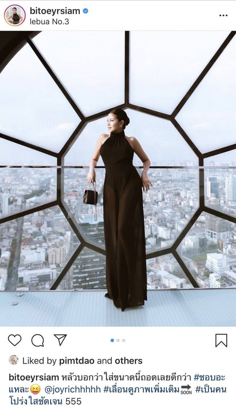 ด้านอินสตาแกรมของสาวใบเตยก็โพสต์ภาพสวมชุดราตรียาวซีทรูสีดำพร้อมแคปชั่นที่อ่านแล้วชวนอมยิ้มว่า “หลัวบอกว่าใส่ขนาดนี้ถอดเลยดีกว่า # ชอบอะแหละ # เป็นคนโปร่งใสชัดเจน 555″ทำเอาโดนเพื่อนดาราและแฟนคลับเข้าไปแซวกันอย่างมากมาย และชมว่าสาวใบเตยดูแลรูปร่างหลังคลอดได้ดีมาก แบบนี้น้องเวทย์มนน่าจะมีน้องตามมาเร็วๆ นี้