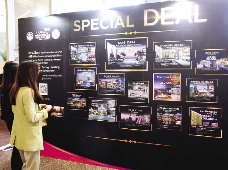 รวมใจช่วยชาติ” ภายใต้แนวคิด “Working Outing & Meeting from Somewhere” ความอิสระที่องค์กรและหน่วยงานสามารถเปลี่ยนทุกที่ของประเทศไทยให้กลายเป็นที่ทำงาน พบปะ พูดคุย สังสรรค์ และจัดประชุม ท่ามกลางบรรยากาศที่แตกต่างไปจากเดิม” ณ พารากอน ฮอลล์ 1 ศูนย์การค้า สยามพารากอน ชั้น 5 เขตปทุมวัน กรุงเทพมหานครเมื่อวันจันทร์ที่ 5 ตุลาคม ที่ผ่านมา ทั้งนี้ ภายในงานมีบริษัทใหญ่ อย่างกลุ่ม ปตท. และการไฟฟ้าฝ่ายผลิตแห่งประเทศไทย (กฟผ.) ให้การสนับสนุนซื้อห้องพักสำหรับการจัดประชุมสัมมนาแล้ว รวมกว่าหนึ่งหมื่นห้อง