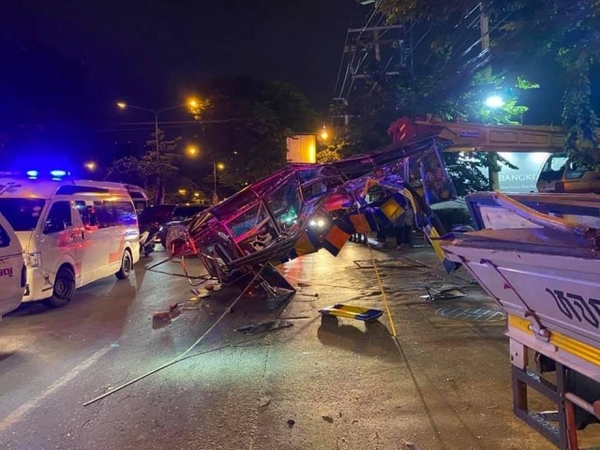 Lumphini Station police, who were alerted to the incident at 9.40pm at a construction site approximately 300 metres from the Japanese Embassy, arrived quickly at the scene to find the roof of the six-wheeler truck, which was modified as a transporter for construction staff, completely torn off by the hook of a yellow crane truck.
