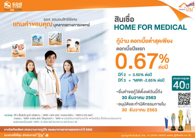 “GHB is arranging Bt10 billion to disburse loans under the ‘Home for Medical’ scheme to help medical professionals get their own residences with less financial burden,” GHB president Chatchai Sirilai said. “The loan will charge 0.67 per cent interest in the first year, 3.5 per cent in the second year, MRR [mininum retail rate] minus 2.65 interest in the third year, and MRR minus one interest from the fourth year until the 40th year, the maximum loan term.”