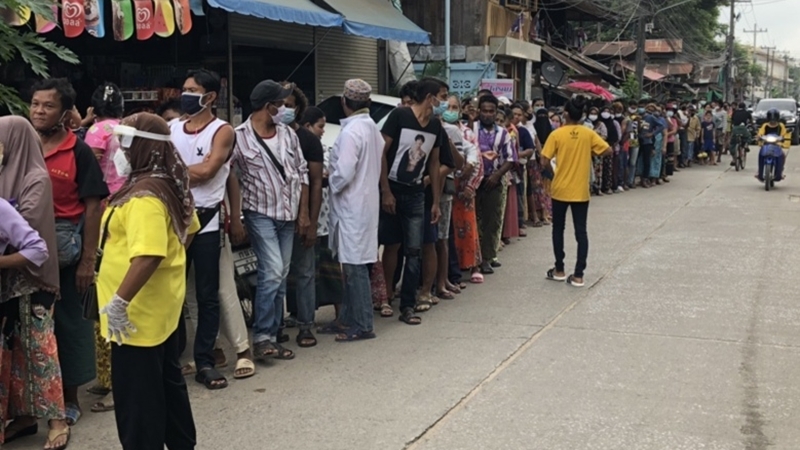 Hundreds of Thais and migrant workers queued up at the Pa Charoen Market in Tak’s Mae Sot district on Tuesday morning to be tested for Covid-19 after three Myanmar drivers, who had come to the district to pick up products, were found to be infected.