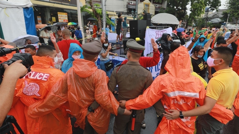 The protesters, however, continued unfazed and decided to recite a poem about people’s power written by Visa Kantap, who had been arrested for participating in the October 14, 1973 uprising, which overthrew the dictatorship of Field Marshall Thanom Kittikachorn.