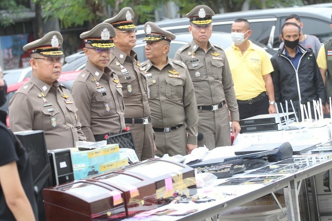 “The four suspects were arrested along with evidence, including a Colt .45 and BUL SAS-2 handguns, 11 luxurious cars including a Porsche Carrera S Coupe, a Nissan GTR, a Benz C43 and a Toyota Alphard, more than Bt1 million in cash, wristwatches, jewellery, 50 bank passbooks, 26 computers and 108 mobile phones. The total estimated value is over Bt75 million.”